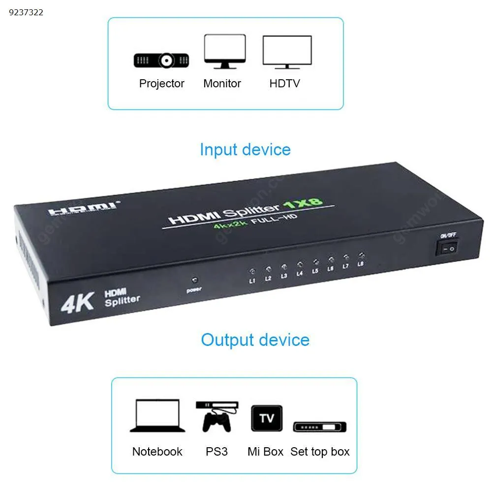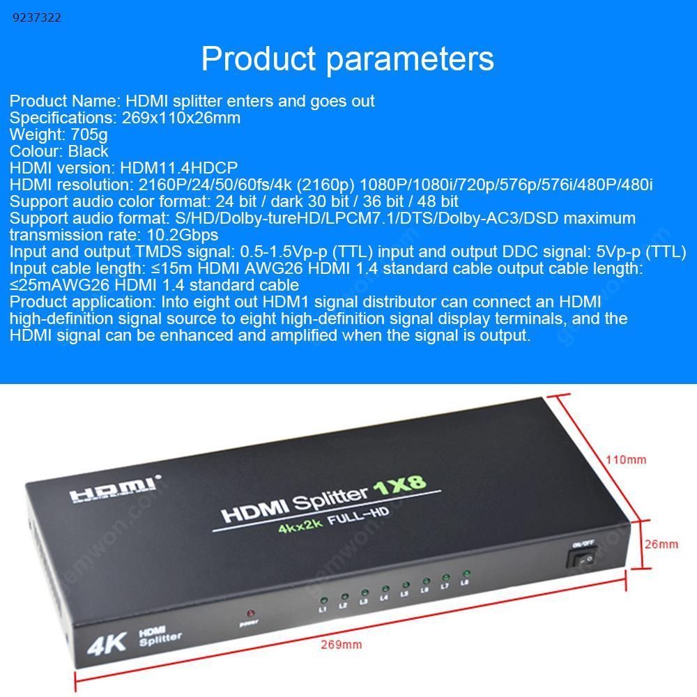 Description Description Brand: gemwon Product size: Applicable scope: HDMI switcher 1x8, support 3D 4K X 2K HDMI V1.4 compatible HDCP1.4 EU HDMI switcher 1x8, support 3D 4K X 2K HDMI V1.4 compatible HDCP1.4 EU
